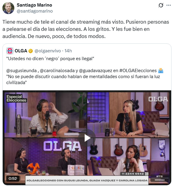 Lejos de ofrecer propuestas alternativas, los nuevos canales se limitaron a copiar la fórmula de las jornadas electorales de los canales tradicionales: mesa, postas y peleas. Lo distintivo esta vez: la rotación furiosa de un puñado de analistas de un canal a otro como si fueran músicos bailanteros en fin de semana