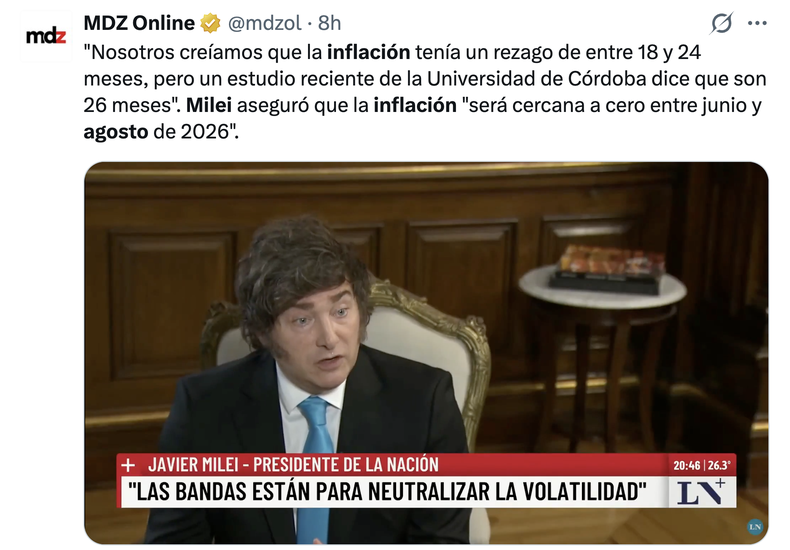 "Nosotros creíamos que era de entre 18 y 24 (meses, pero) un estudio reciente de la Universidad de Córdoba muestra que son 26 meses (…) ¿Esto qué quiere decir? Si nosotros fijamos la cantidad de dinero (y) se terminó de sanear el Banco Central a mediados de 2024", la inflación debería extinguirse antes de agosto próximo.